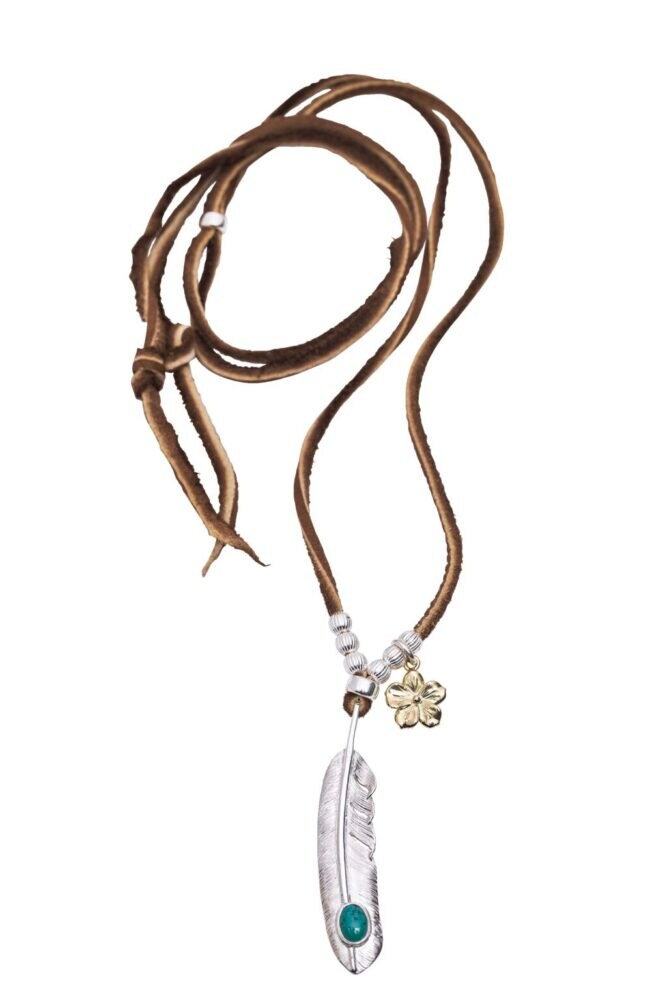 革紐バージョン。革紐の場合はビースが必須。そのデザインも様々あり、バランスを見ながら配置してくれる。ターコイズ付きのフェザーをメインにゴールドのフラワーのチャームをつけてみた。フェザーが右曲がりだからチャームも右側に!