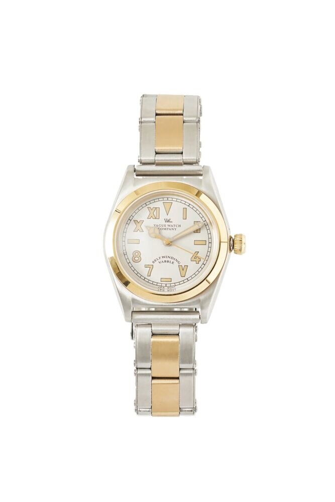 世界初の防水性能を持つ自動巻き時計として誕生した名作をモチーフとしたモデル[ヴァブル]のコンビネーションカラー。上半分がローマ数字、下半分にアラビア数字を配したユニークな文字盤とゴールドとシルバーの配色が秀逸。6万4900円