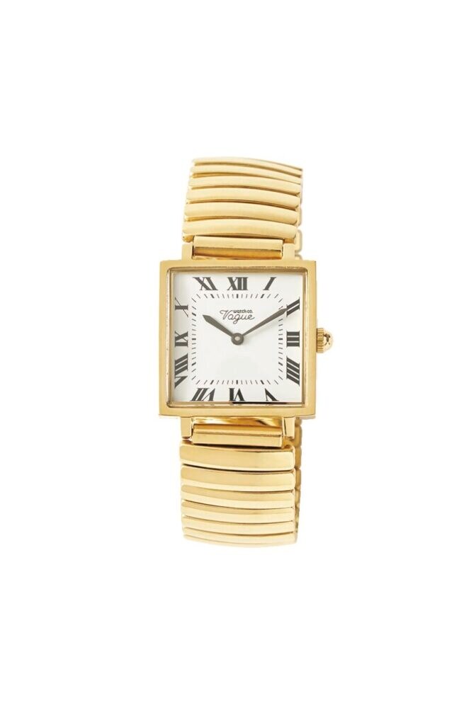 日本製クォーツムーブメントを搭載したスクエア型。ミニマムな本体ケースに対して厚みのある風防ガラスを組み合わせることで端正かつ存在感のある表情に。コマの繋ぎ目がバネ式のエクステンションベルトによって着脱も容易。3万8500円
