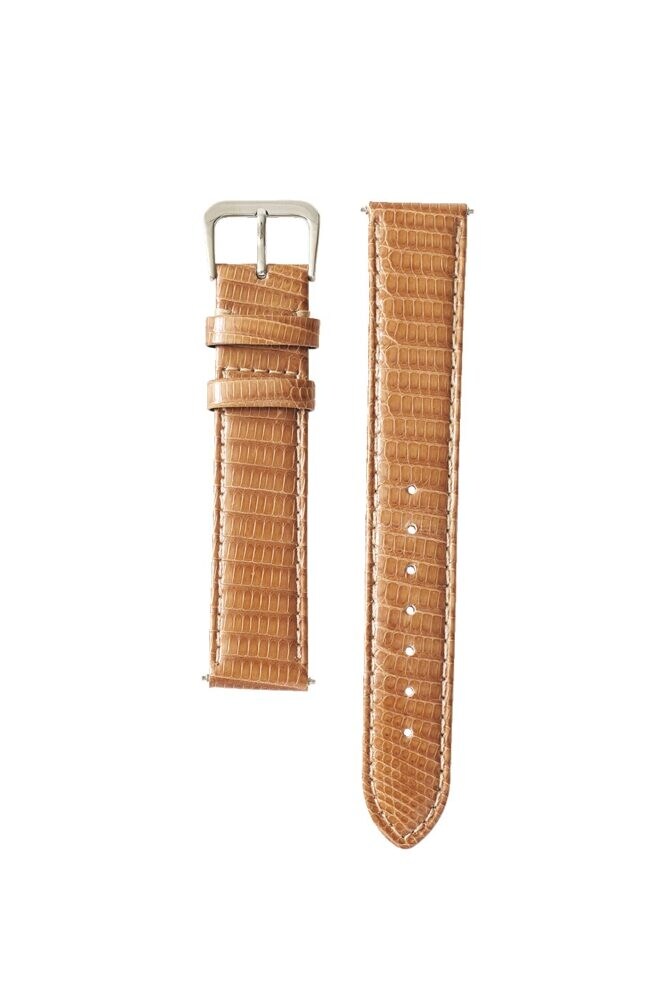 エキゾチックレザーの中でもクロコダイルと並んで最高級に位置付けられるリザードのベルト。高い耐久性を備え、繊細かつ個性的な模様からはエレガントなムードが漂う。柔らかなブラウンとシルバーの尾錠との色のバランスも二重丸。9900円