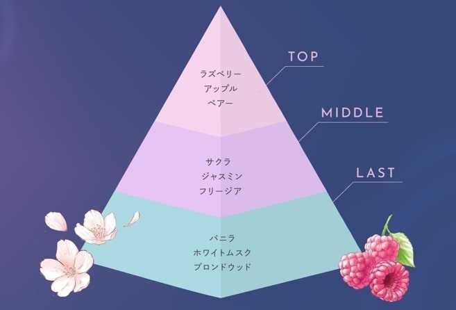 香りはジューシーなアップルとラズベリーが弾け、サクラやフリージア、ジャスミンが上品に香るフルーティーフローラル。