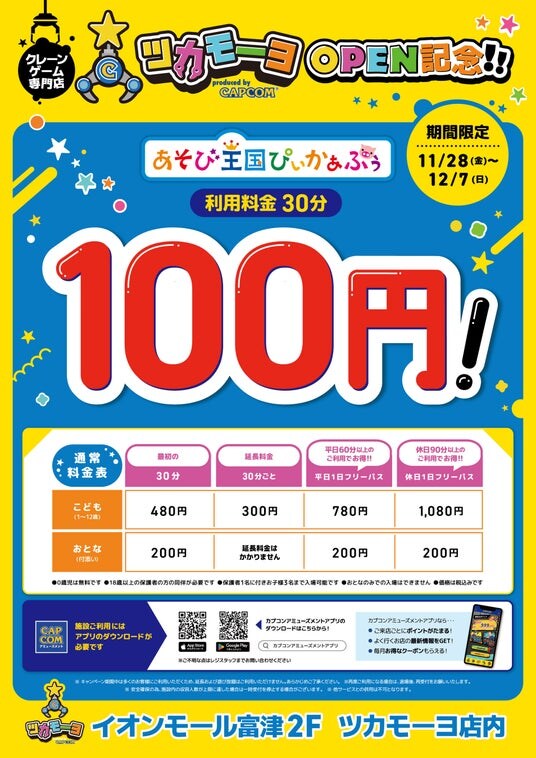 株式会社カプコンは、2025年11月28日(金)にクレーンゲーム専門店「ツカモーヨ」をイオンモール富津にオープンいたします。