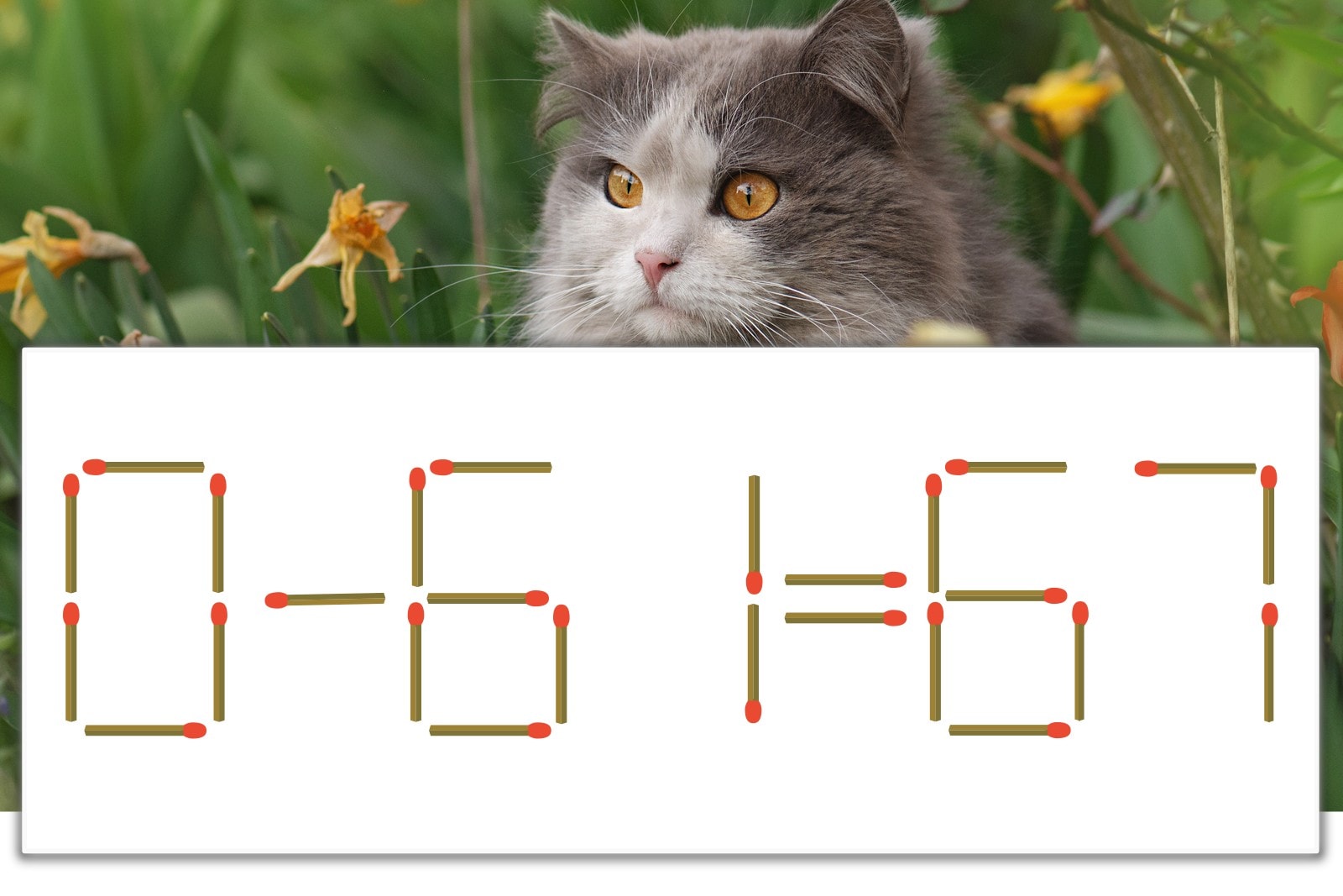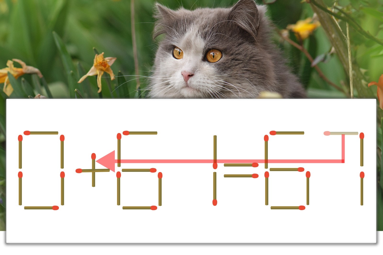 「7」を別の数字に変化させると答えが導き出せます。「7」のマッチ棒を1本移動して、「-」を「+」にしてみましょう。すると、「0+61=61」が成立します。