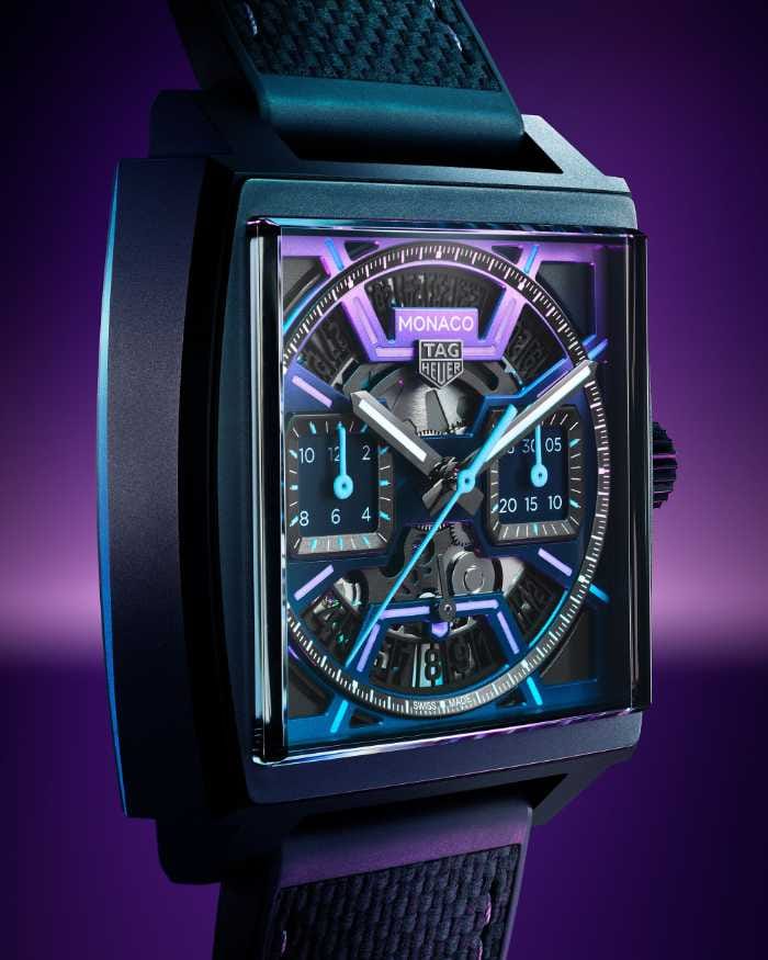 最新モデルは、ナイトレースの宵闇と街の光からインスパイア。中央オープンワークダイヤルはパープルから深いブルーへのグラデーションで、夕暮れから真夜中の移ろいを表現。