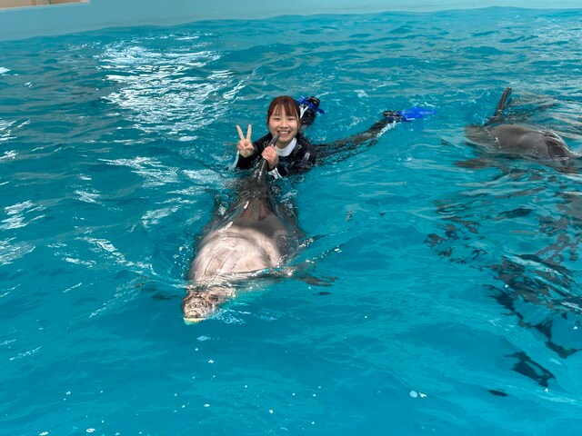 ウェットスーツを着てイルカのプールに入り、イルカと一緒に泳いで触れ合うことができます。イルカの背びれにつかまって泳ぐなど、イルカの体温や感触、呼吸を感じて仲良くなってください!
