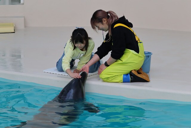 小さなこどもから気軽に参加できる「餌やり体験」では、イルカに触れて餌を与えることができます。「トレーニングタイム」の前に開催されているので、餌やり体験とセットで楽しんでくださいね。