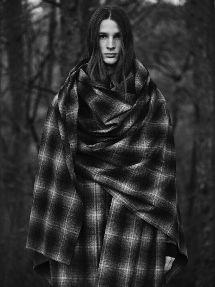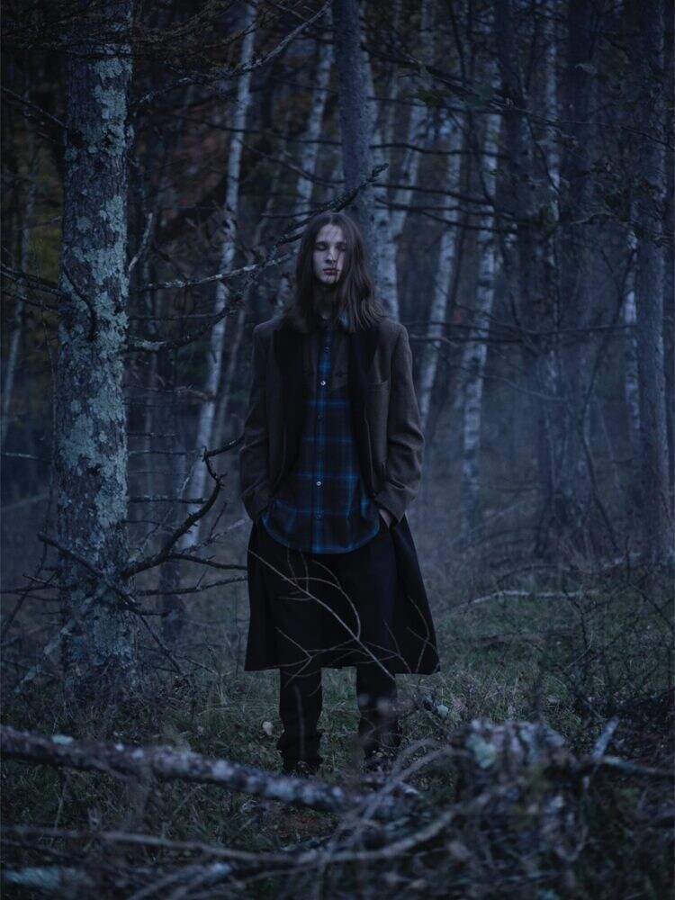 本コレクションでは、Yohji Yamamoto POUR HOMME 2008-09AWランウェイに登場したチェック柄アイテムを再構築し、ジャケット、シャツ、パンツを展開する。ブランケットのように贅沢にチェック生地を用いた分量感のあるストールジャケットや、レイヤード構造のジャケット、プリーツ部分にチェック生地を縫い込んだジャケットなど、ロング丈のジャケットに細身シルエットのパンツを組み合わせている。希少なUSメイドのペンドルトンチェック生地のオーセンティックで温かみのある表情を、ヨウジヤマモトならではのシルエットやデザインと組み合わせ、新たなスタイルとして提示する。