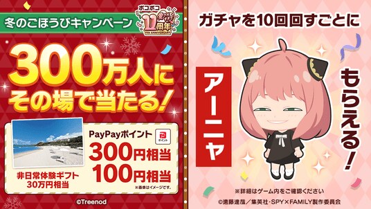 期間中、ミッションをクリアしてガチャをまわすと、「JTBトラベルギフト(30万円相当)」や「PayPayポイント」など豪華賞品が300万人にその場で当たります。さらに、ガチャを10回まわすごとに「アーニャ・フォージャー(私服)」が必ずもらえます。