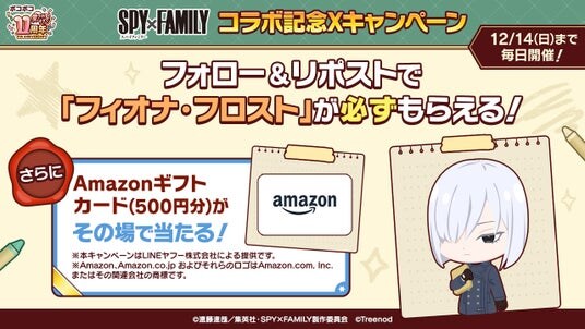 「LINE ポコポコ」の公式X(旧Twitter)アカウント(@LINE_PKPK_JP)と『SPY×FAMILY(スパイファミリー)』アニメ公式アカウント(@spyfamily_anime)をフォローしてキャンペーンポストをリポストすると、抽選で「Amazonギフトカード 500円分」が当たります。 さらに、本キャンペーンに参加された方全員に、コラボ仲間「フィオナ・フロスト」をプレゼントします。