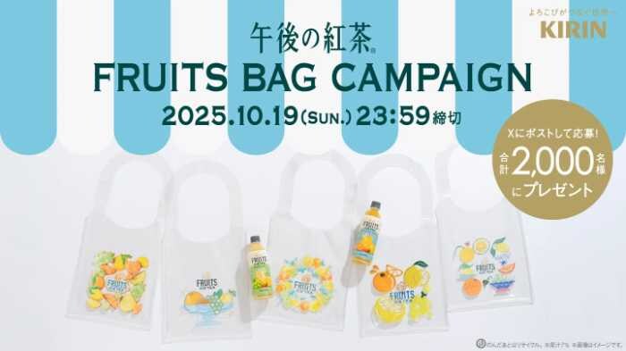 新作発売を記念して、5種類のアーティストデザインから選べる「午後ティーフルーツバッグ」が抽選で2,000名に当たります。応募は9月22日(月)11:00~10月19日(日)23:59まで。