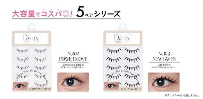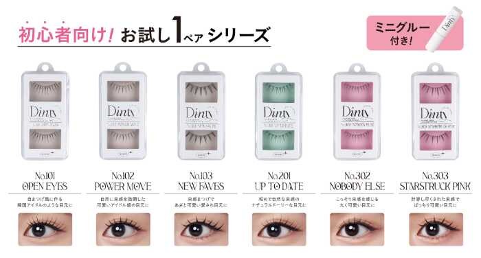 サン・スマイルのつけまつげブランド「Dinty(ディンティー)」から、新作が登場♡初心者向けのミニグルー付き1ペアタイプは、人気No.101オープンアイズやNo.102パワームーブなど6品番をラインナップ。まとめ買いに便利な5ペアタイプはNo.102とNo.103をご用意。軸が細く柔らかく改良され、より軽やかで快適なつけ心地を楽しめます♪