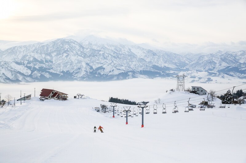まずは足慣らしにカービングを楽しむことにした井桁さんと斎木さん。第1クワッドリフトと第3ペアリフトに乗ってスキー場頂上に到着した二人の目に飛び込んできたのは、南魚沼市を覆い尽くす雲海。そして越後の山並みだ。魚沼平野は寒暖差が激しく、盆地地形なので雲海が起こりやすい。ムイカスノーリゾートでも時折見られる光景だ。
