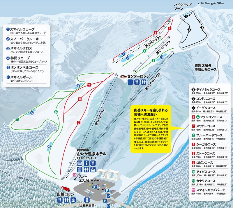 関越道六日町ICから車で約5分の場所にあるムイカスノーリゾートは、そのアクセスの良さもさることながら緩斜面を中心としたゲレンデ設計で、多くのファミリーや学生団体のスキー客で賑わっている。ゲレンデの中腹より上は眼前に南魚沼市街や巻機山、八海山をはじめとした越後三山の山並みの絶景が広がる。