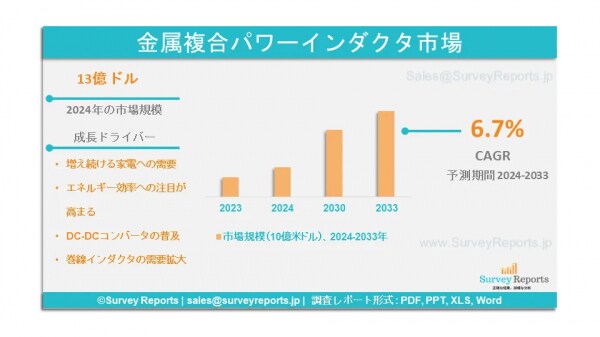 Surveyreportsの専門家は、金属複合パワーインダクタ市場の調査を分析し、2023年に金属複合パワーインダクタ市場規模が13億米ドルに達すると予測した。さらに、金属複合パワーインダクタ市場のシェアは、2032年末までに25億米ドルの収益に達すると予測されている。金属複合パワーインダクタ市場は、2024年から2033年の予測期間にわたって、年間平均成長率(CAGR)約6.7%で成長すると予測されている。