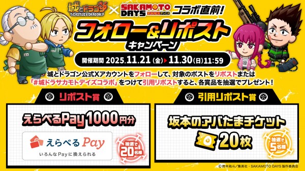 11月30日(日)より『城とドラゴン』にて、TVアニメ『SAKAMOTO DAYS』との初のコラボイベントを開催することが決定いたしました。コラボ限定キャラ「坂本&シン」や、城ドラキャラの新しい激レアお着替えが登場するほか、11月21日(金)からは「コラボ直前!フォロー&リポストキャンペーン」をXにて実施いたします。ぜひこの機会をお見逃しなく!