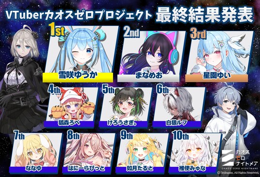 カオスゼロナイトメアの正式リリースに合わせ10月21日に開幕した「VTuberカオスゼロプロジェクト」は、11月3日に堂々のフィナーレを迎え、ついに最終結果が発表されました。熾烈な争いを制した雪咲ゆうかさんが見事優勝に輝き、続いてまなめおさんが2位、星園ゆいさんが3位にランクイン。さらに狐森ろべさんが4位、けろうさぎ。さんが5位と続き、最後まで目が離せない熱戦となりました。
