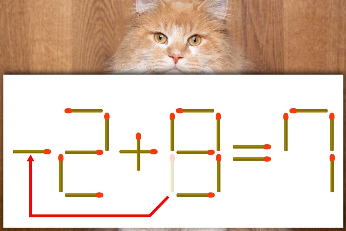 「8」のマッチ棒を1本、「2」の前に移動させて「-」を作り、「-2+9=7」にする。※解答は複数ある場合があります。