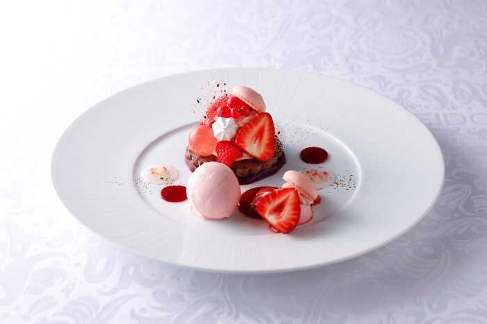 「九州産“恋みのり”とルビーチョコレートのタルト仕立て」2,700円は、苺のジュレやルビーチョコレートのアイス、マカロンを添えた贅沢な一品。