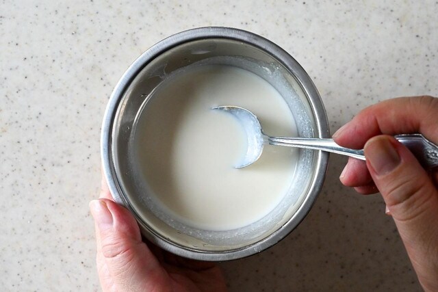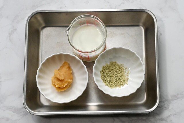 【04】蒸している間に、牛乳、白味噌、顆粒だしをよく混ぜ合わせておく。
