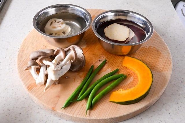 【01】根菜類は5mm幅に切る。サツマイモは水にさらし、レンコンは酢水に浸け、水気を拭きとっておく。きのこは食べやすく株を分ける。インゲン豆はヘタを切り落とす。