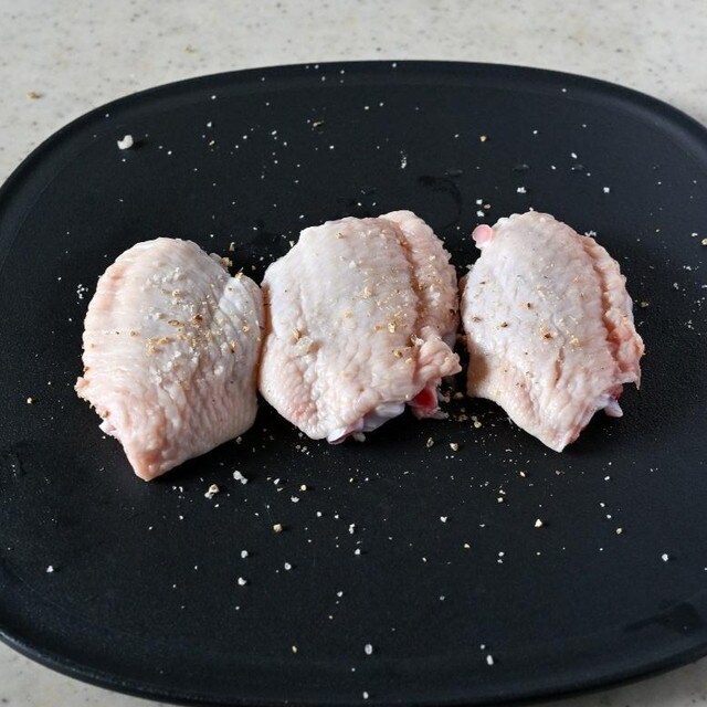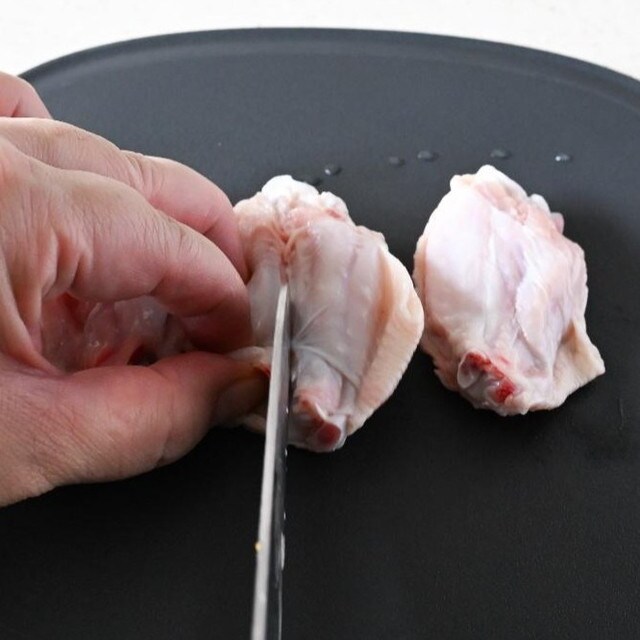 【02】手羽中は皮の反対側の骨の間に切り込みを入れ、塩・こしょうする。