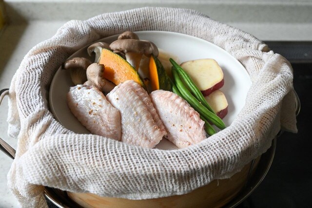 【03】せいろに濡らした蒸し布を敷き、皿を入れて野菜と手羽中を盛り付ける。ふたをして強火で約13分蒸す。