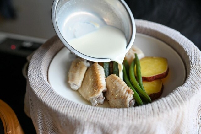 【05】蒸しあがったら一度ふたを開け、手羽中に火が通っていたら【04】を注ぎ、追加で約2分蒸して温める。