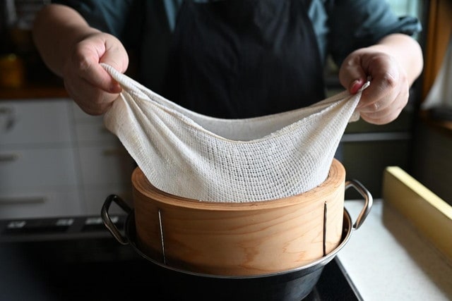 【06】ふたを開けて蒸し布を持ち上げるように取り出せば完成! 皿のまま食卓へ。