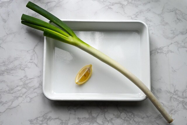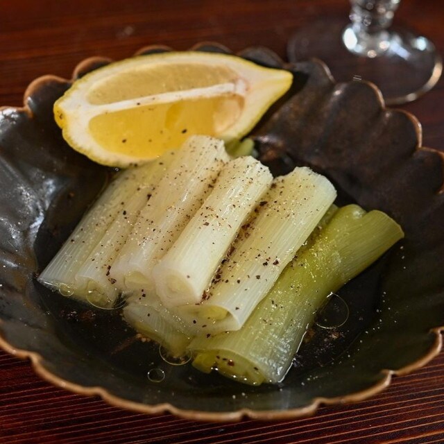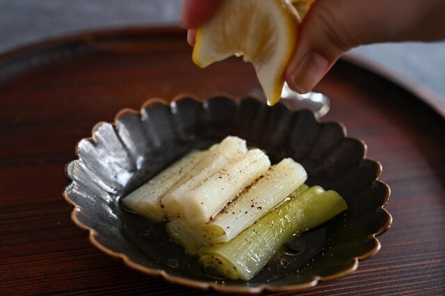 【03】蒸しあがった白ねぎに、塩、黒こしょう、オリーブオイルをかけ、レモンを絞って完成!