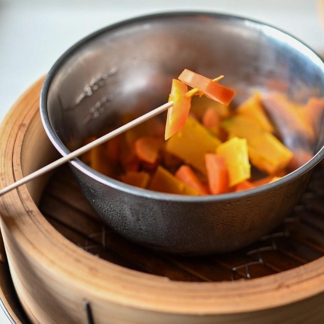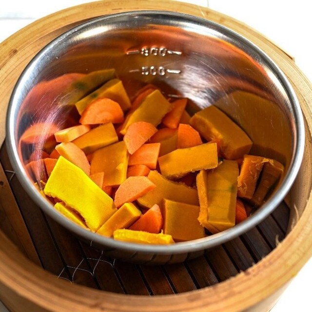 【02】せいろにかぼちゃと人参を入れたボウルを入れ、やわらかくなるまで強火で約12分蒸す。