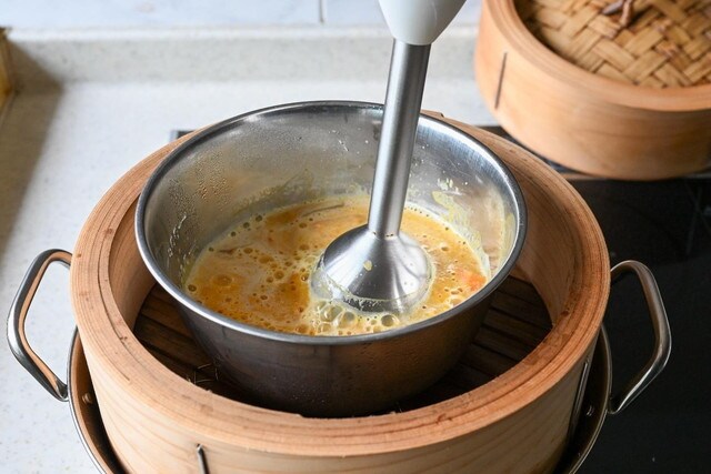 【03】蒸しあがったら牛乳を加え、ブレンダーですり潰す。追加で約2分蒸して温める。