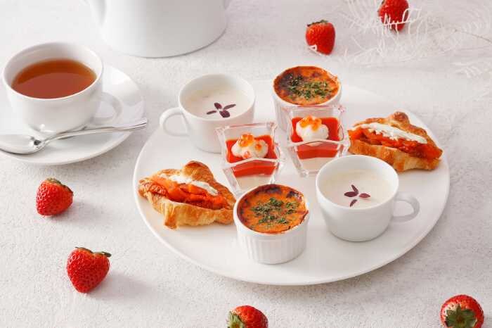 スイーツスタンドには、赤と白のコントラストが印象的な「べにたまとホワイトチョコレートのレイヤードパフェ」をはじめ、華やかな全8品がラインナップ。