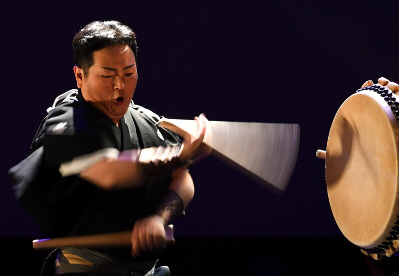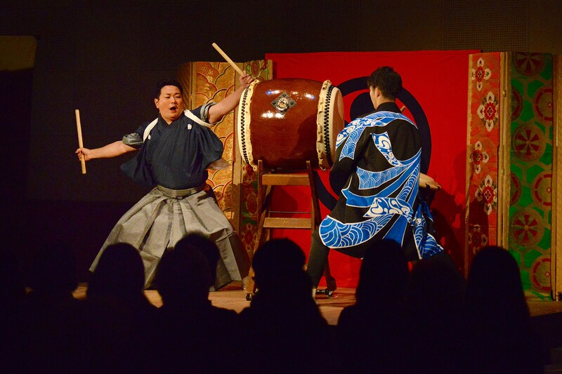 実は、桶太鼓を肩から担いで演奏したり、特大の太鼓を一人で叩いたりするスタイルも、戦後に生まれた新しい演出法だそうです。