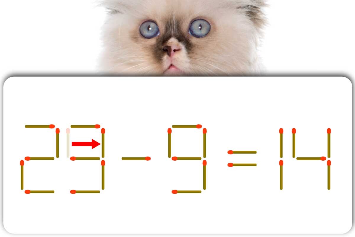 「5」のマッチ棒を1本、右にスライドさせて「3」を作り、「23-9=14」にする。※解答は複数ある場合があります。