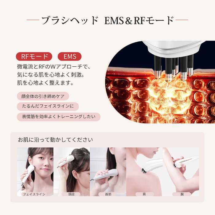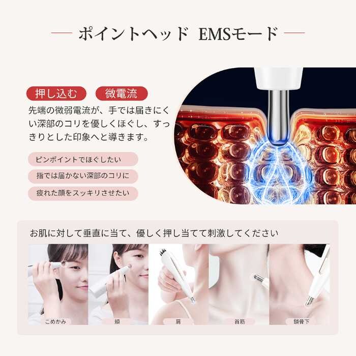 バネ式構造で強さ調整が可能で、EMSが微弱電流で筋肉にアプローチ。多極ブラシヘッドと組み合わせれば、顔や首・肩の疲れを隅々までケアできます。