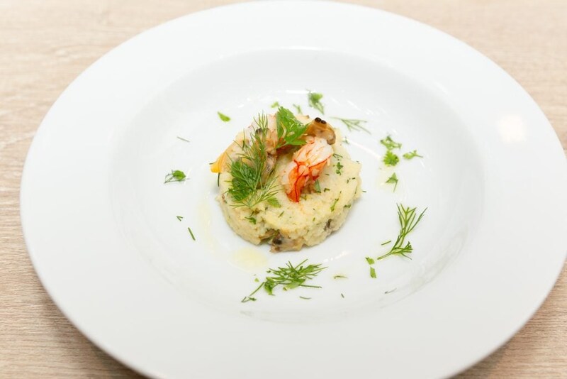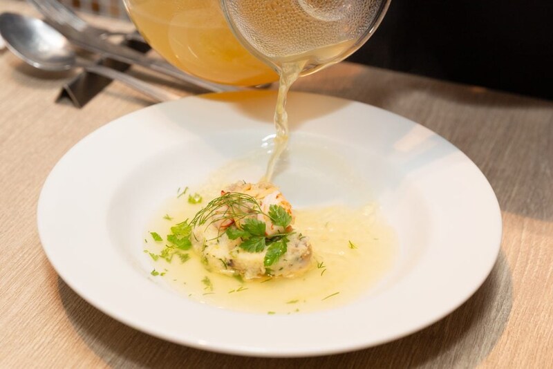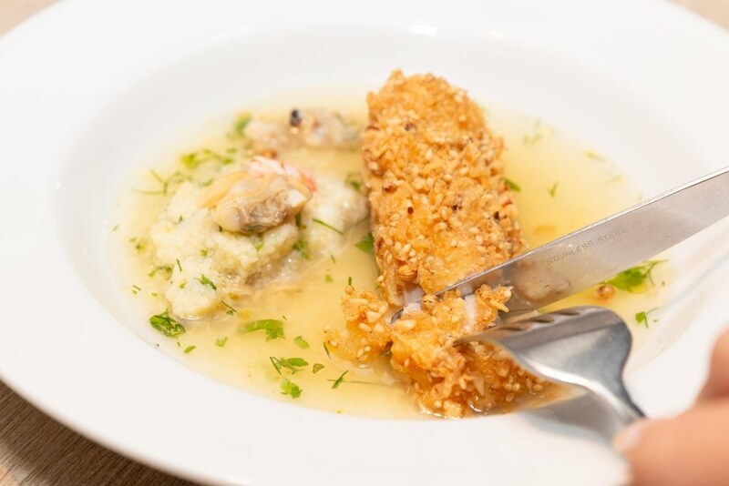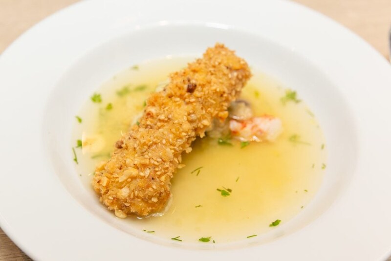 1/3食べたところで温かいスープが注がれ、「イタリアのクスクス・トラパネーゼ」に。エビの殻や真鯛の頭などの魚介で出汁をとったスープが絶品で、魚介のタブレの旨みとの相乗効果で驚きの美味しさが広がります。