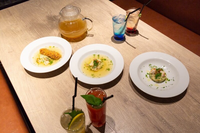 オープンに先駆け、11月5日(水)にメディア関係者向けの試食会が開催。アニメの主人公・岳が考案した「三位一体コース」(試食用サイズ)、食事との相乗効果を生みだすオリジナルドリンク(ノンアルコール全4種)をいただいてきました!