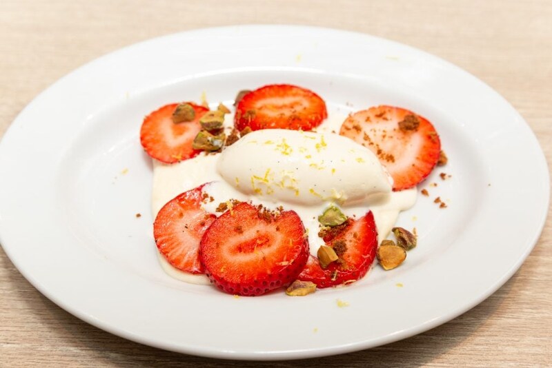 最後に運ばれてきた「苺のタルト」は、作中でデザートレシピの考案に悩む岳へ海がふるまった特別な一皿。「三位一体コース」を含む全てのコースについてくるスイーツです。甘くてなめらかなアイスと、オリーブオイルで仕立てられたサクサクのクランブルの異なる食感が楽しめます。