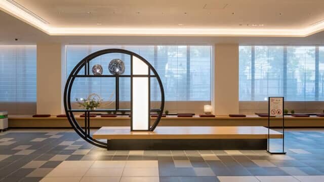 ▲ロビーにある工芸品のような縁台は、庭園の景色を切り取った窓がテーマ