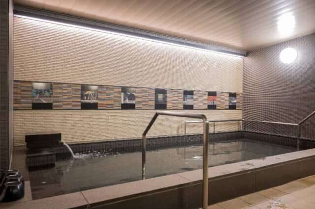 間接照明に彩られた雰囲気のいい浴室には広い湯船がひとつあり、足を伸ばして入れるので疲れを癒せます。壁には京都の街並みを風情溢れるアングルで描いたアートタイルが飾られます。版画家の斎藤清とクリストフ・カーフの絵は、男女のお風呂場で作家が異なりますが、見る価値のあるいい眺めです。