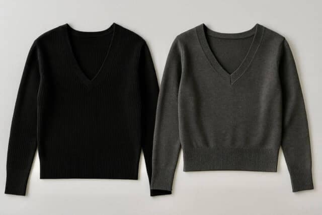 ▲昔の深めV&ボックスシルエット(左)だと胸元の開きが大きく、全体が直線的で古く見えやすい。一方、今どきの浅めV×コンパクトフィット(右)なら、開きすぎないVラインと細めリブで上品&洗練バランスに