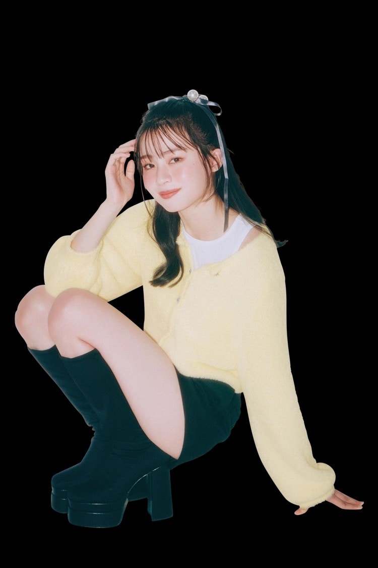 アンジュルム・下井谷幸穂's comment「スカートにもパンツにもあうカーディガンが最強!もこもこふわふわで冬らしさと甘さが出るのが可愛い♡」