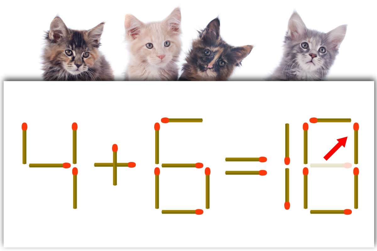 「6」のヨコ向きのマッチ棒を1本、タテ向きに回転してから右上に移動させて「0」を作り、「4+6=10」にする。※解答は複数ある場合があります。