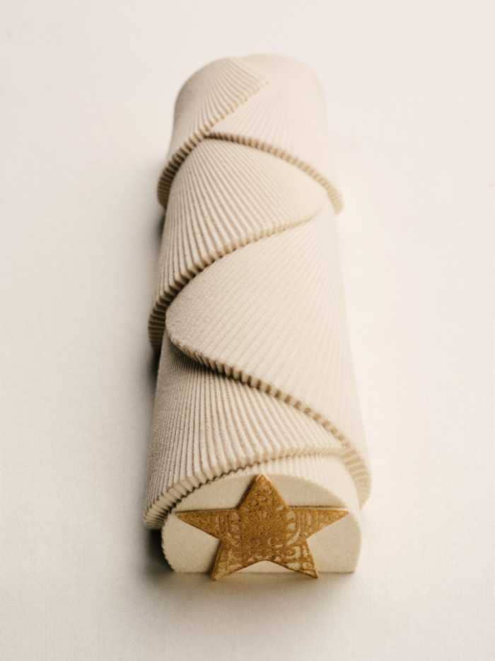 今回の限定ブッシュドノエルは、1950年にクリスチャン・ディオールが手掛けたフランシス・プーランクのオートクチュールドレスを思わせる、ベルベットのようなホワイトプリーツが特徴。