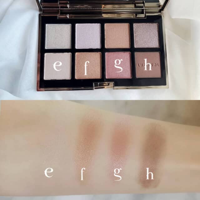このパレットでまず試してほしいのが、C・D・E・Hを使った洗練ブラウンメイク。ベースにEのまろやかブラウン、二重幅~目尻にHの影色ブラウンを重ね、最後にDの高輝度ホワイト&ブルーラメを中央に少量オン。これだけで一気に奥行きが生まれ、“冬のメタリック感”が漂う今っぽい仕上がりに。濃く見えないのに存在感が出せるため、オフィスにも夜の予定にもフィット。光の角度で印象が変わるので、シンプルな服の日でもメイクで華やかさが手に入ります。