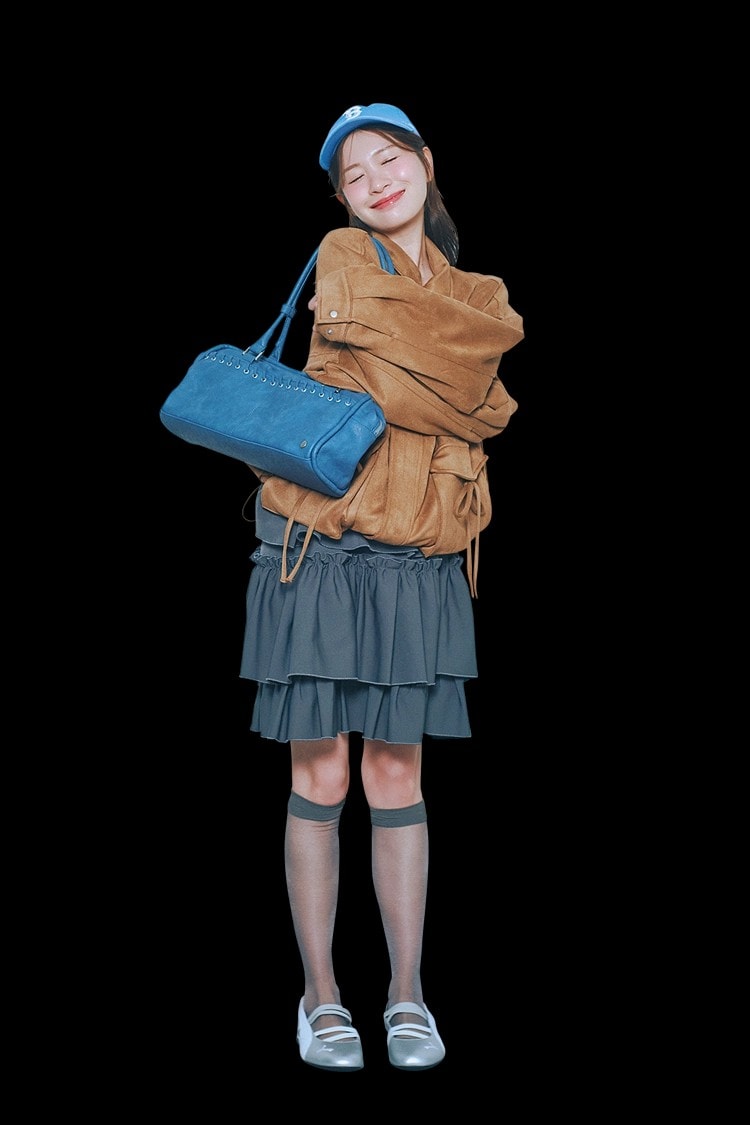 ブルーをあわせれば一気にこなれ感を演出できる。ミニワンピとハイソックスでをプラスして女みも忘れずに!