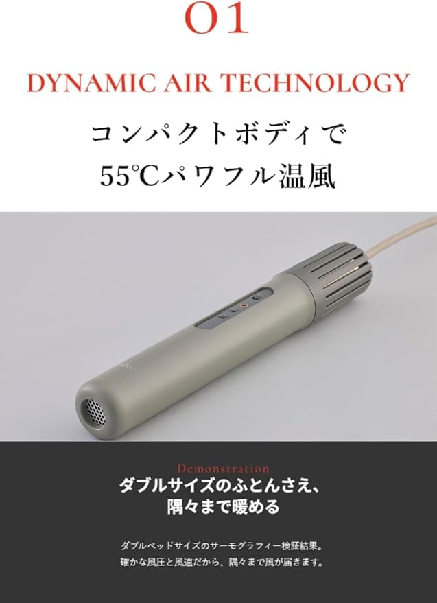 ■「いいな」「ほしい」の声世界最小級と言われるスティックタイプの同布団乾燥機は、本体のボタンから「あたため」「乾燥」「ダニ対策」「送風」の4つのコースを選ぶことができ、2mまで届く高風速でパワフルな温風を実現。