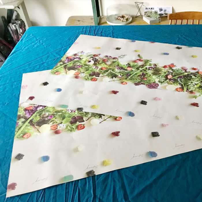 お菓子だけでなく、テーブルを華やかに演出するオリジナルグッズも展開。耐水耐油ペーパー「サラダロードシート」はカラー・ホワイト・ブラックの3色展開で、食卓に直接敷いて使える便利アイテム。
