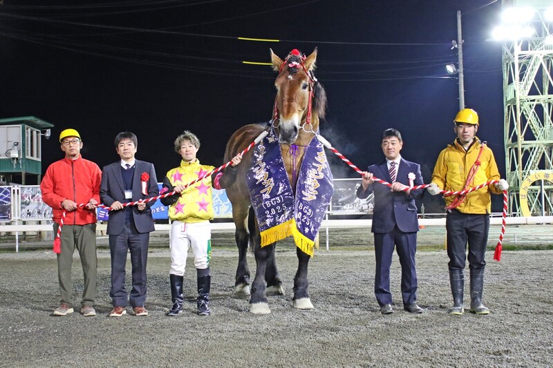 「非常に嬉しいです。まずは第一障害をうまく上げることを考えていましたが、上手くスタートすることができ、第一障害でちょっと緩みかけましたが、うまくいきました。第二障害まで止めずに行ったので、障害の天板で止まってしまい、少しきつかったと思います。障害を下りてからは前に2頭いたのですが、苦しい中最後まで頑張ってくれました。応援ありがとうございます。これから寒くなってきますが、ばんえい競馬をよろしくお願いします」