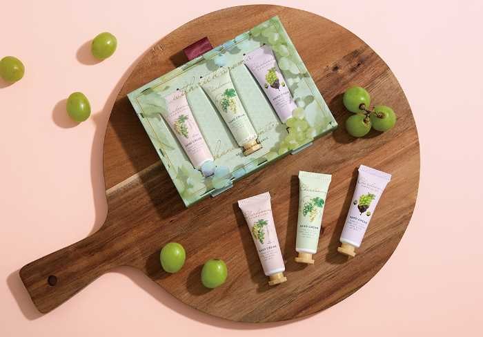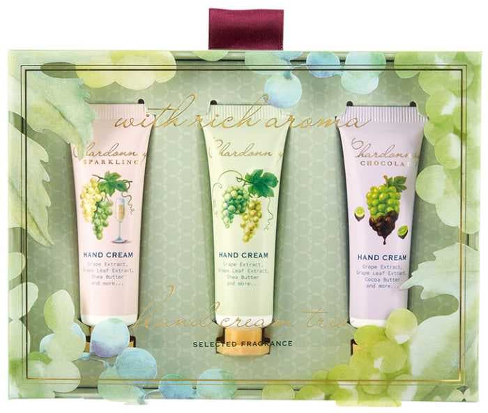 「シャルドネスパークリング」「シャルドネ」「シャルドネショコラ」のアロマを楽しめる新作ハンドクリームトリオは、3本セットで1,100円(税込)。内容はハンドクリーム10mL×3個です。